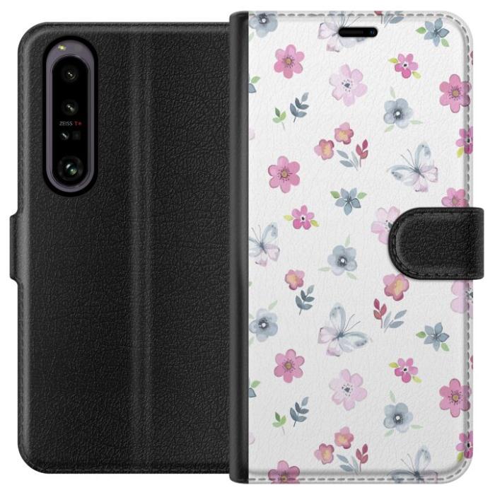 Plånboksfodral för Xperia 1 IV med Blommor och fjärillar -design. Fodralet kombinerar stil och funktion – ett slitstarkt mobilskal som skyddar mot repor och stötar samt praktiska kortfack på insidan.