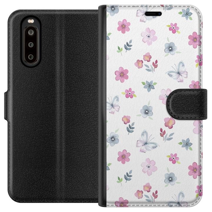 Plånboksfodral för Xperia 10 II med Blommor och fjärillar -design. Fodralet kombinerar stil och funktion – ett slitstarkt mobilskal som skyddar mot repor och stötar samt praktiska kortfack på insidan.