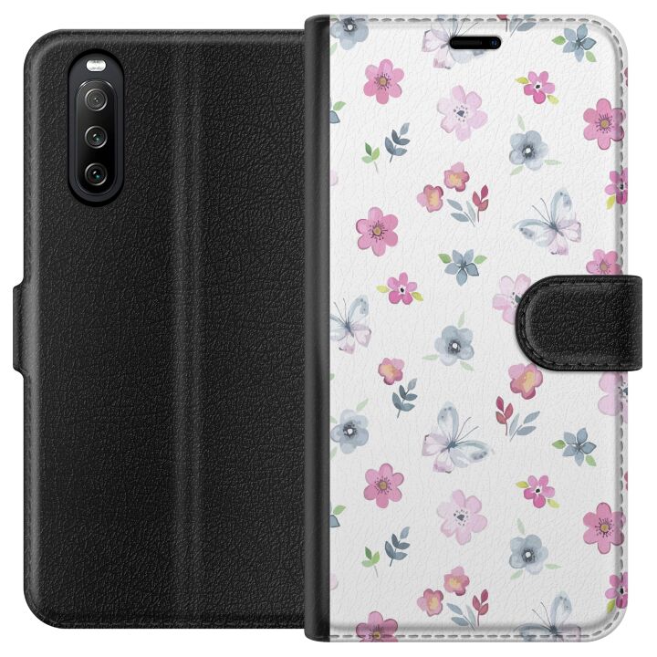 Plånboksfodral för Xperia 10 III med Blommor och fjärillar -design. Fodralet kombinerar stil och funktion – ett slitstarkt mobilskal som skyddar mot repor och stötar samt praktiska kortfack på insidan.