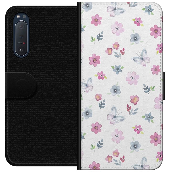 Plånboksfodral för Xperia 5 II med Blommor och fjärillar -design. Fodralet kombinerar stil och funktion – ett slitstarkt mobilskal som skyddar mot repor och stötar samt praktiska kortfack på insidan.