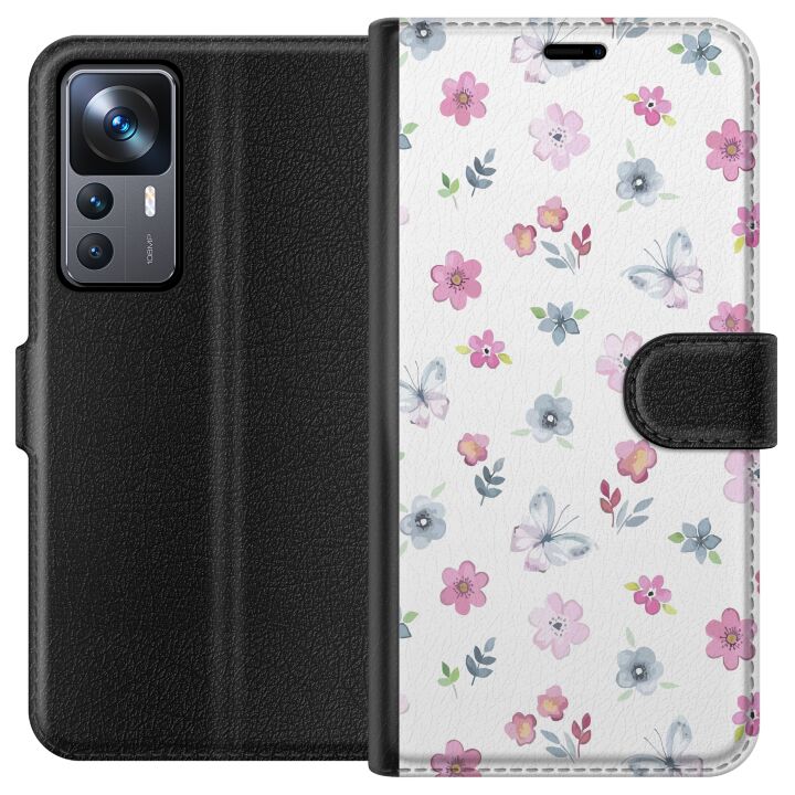 Plånboksfodral för 12T med Blommor och fjärillar -design. Fodralet kombinerar stil och funktion – ett slitstarkt mobilskal som skyddar mot repor och stötar samt praktiska kortfack på insidan.