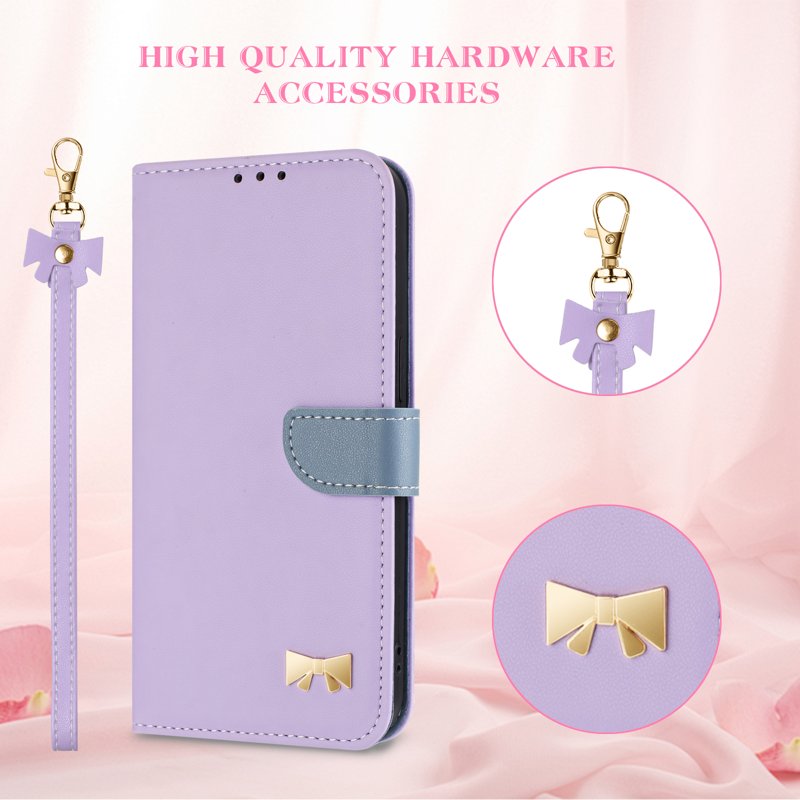 Skydda din Samsung Galaxy A55 5G med Bowknot Decor Wallet Leather Phone Cover. Denna eleganta och funktionella mobilfodral kombinerar stil med säkerhet. Med en vacker lila färg och praktiska funktioner är detta fodral perfekt för den moderna användaren.