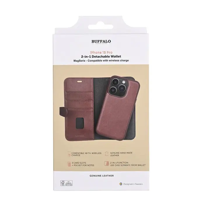 Buffalo Äkta Läder iPhone 15 Pro Plånboksfodral Magsafe 3 Korts - Brun