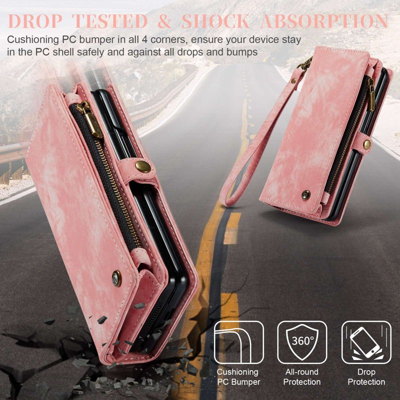 Denna premium PU-läderfodral med TPU-inre skydd erbjuder en perfekt kombination av stil och funktionalitet. Med flera kortfack och en säkerhetsdragkedja är det den idealiska lösningen för att hålla dina värdesaker organiserade. Njut av handsfree-visning och skydd mot stötar och fall.