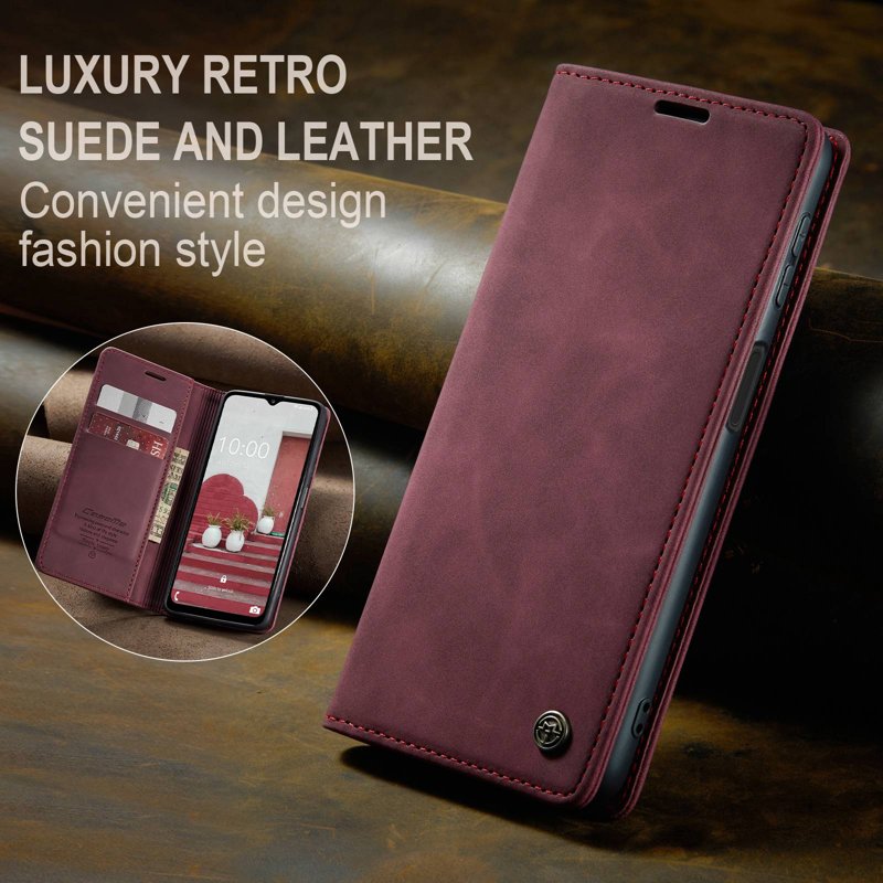 Luxury Retro Suede och Leather är en stilren och funktionell mobilfodral. Tillverkat av noggrant utvalt PU-läder och TPU, erbjuder det både skydd och elegans. Med smarta fack för kort och kontanter gör det din vardag enklare. Njut av handsfree-visning med en justerbar ställning.