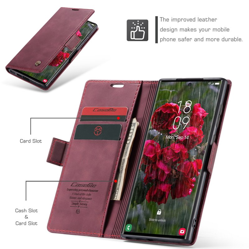 Detta fodral kombinerar stil och funktionalitet. Tillverkat av noggrant utvalt PU-läder och TPU, erbjuder det ett retro utseende och skyddar din telefon effektivt. Med smarta fack för kort och kontanter blir din vardag enklare.
