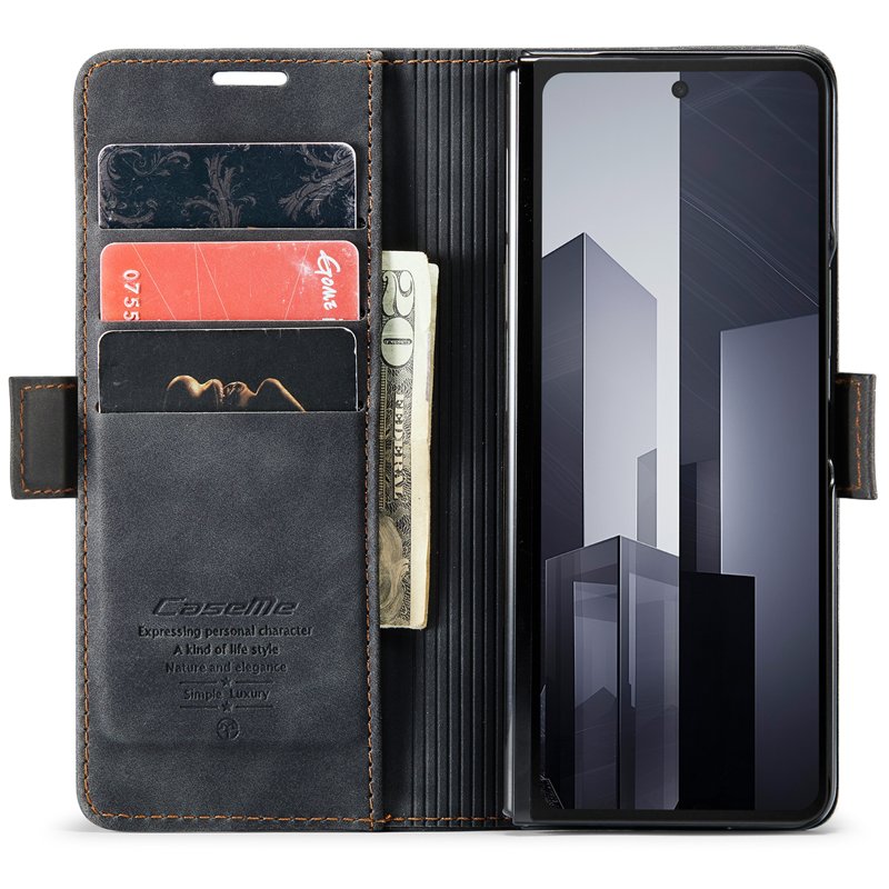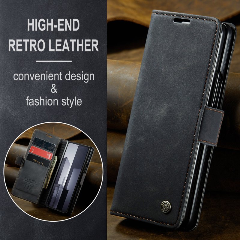 Detta fodral kombinerar stil och funktionalitet. Tillverkat av noggrant utvalt PU-läder och TPU, erbjuder det en retro känsla och skyddar din telefon effektivt. Med smarta fack för kort och kontanter blir din vardag enklare.