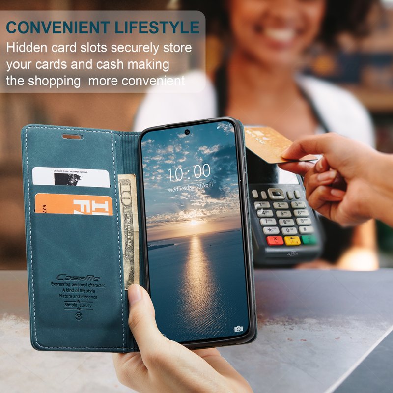 Detta fodral kombinerar stil och funktionalitet. Tillverkat av noggrant utvalt PU-läder och TPU, erbjuder det en retro känsla och skyddar din telefon effektivt. Med smarta fack för kort och kontanter gör det din vardag enklare.