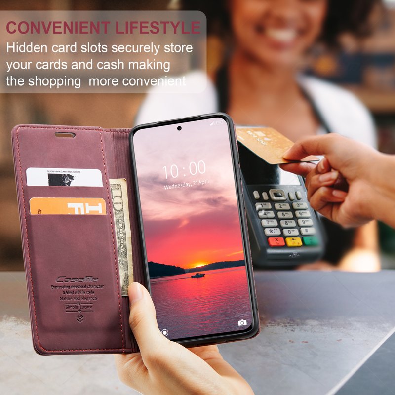 Detta fodral kombinerar stil och funktionalitet. Tillverkat av noggrant utvalt PU-läder och TPU, erbjuder det en retro känsla och skyddar din telefon effektivt. Med smarta fack för kort och kontanter gör det din vardag enklare.
