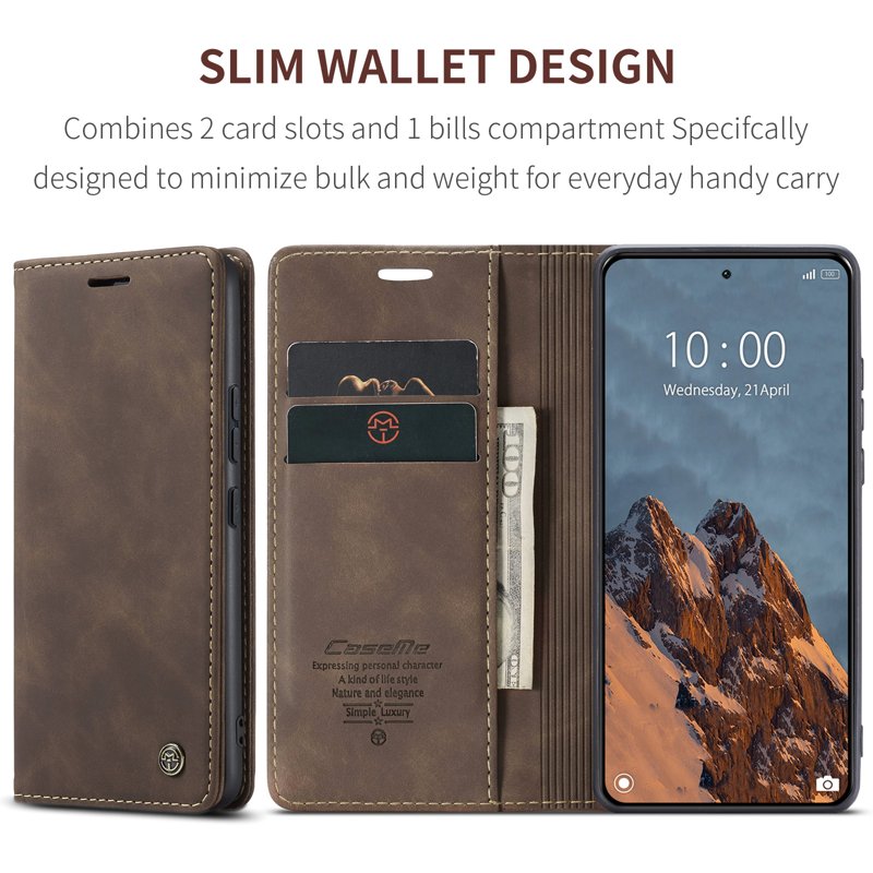 Detta fodral kombinerar stil och funktionalitet. Tillverkat av noggrant utvalt PU-läder och TPU, erbjuder det ett retro utseende och skyddar din telefon effektivt. Med smarta fack för kort och kontanter blir din vardag enklare.