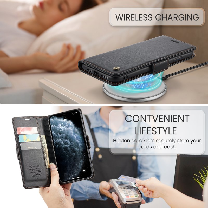 Denna plånboksfodral kombinerar elegans med funktionalitet. Tillverkat av högkvalitativt PU-läder och TPU, erbjuder det fullständigt skydd för din telefon. Med smarta fack för kort och kontanter blir din vardag enklare. Dessutom skyddar den din personliga information med avancerad RFID-blockering.