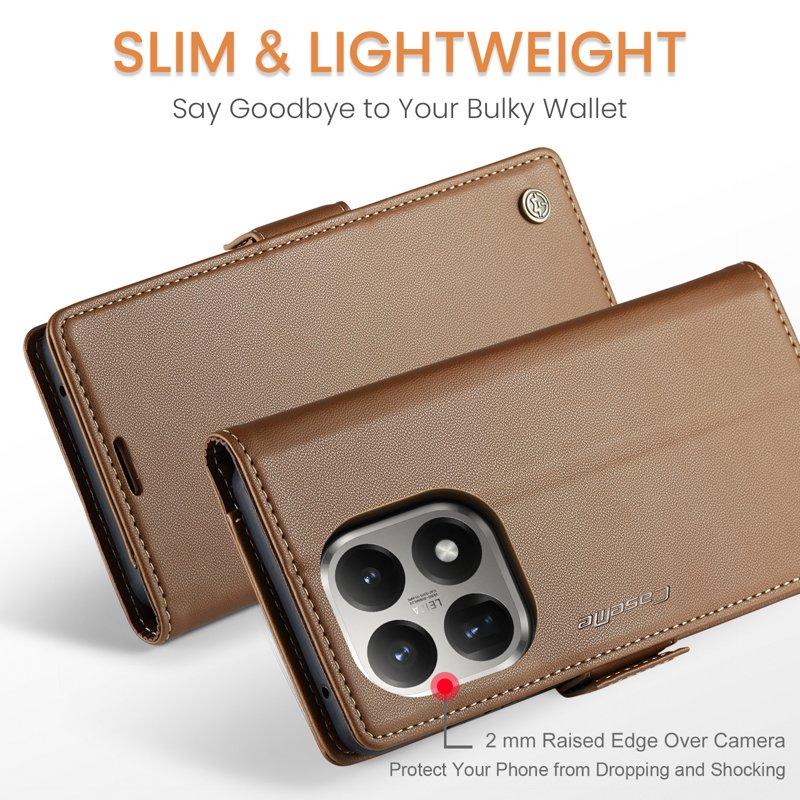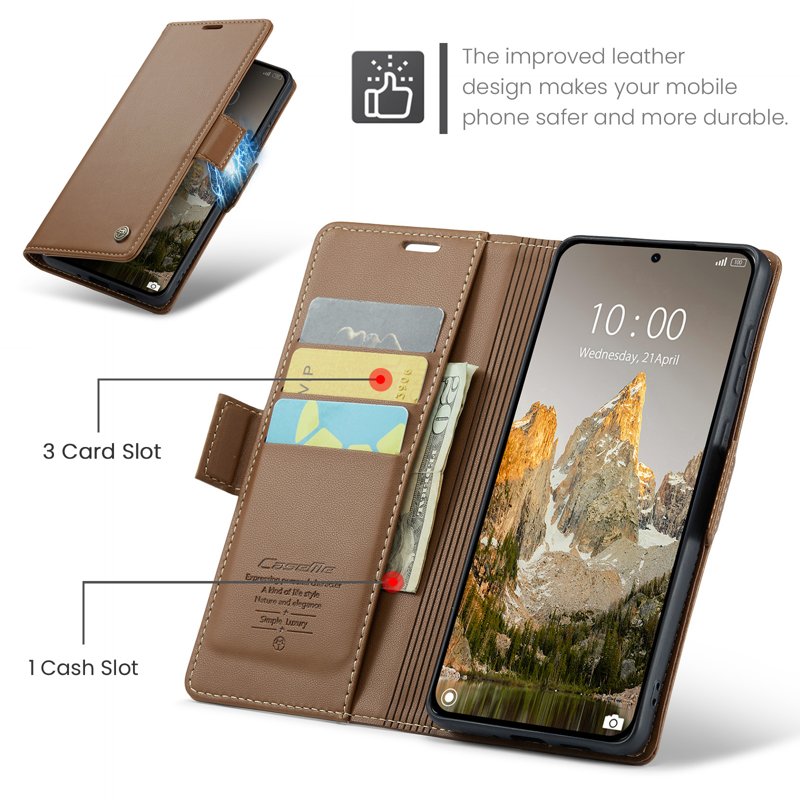 Denna plånboksfodral kombinerar elegans och funktionalitet. Tillverkat av högkvalitativt PU-läder och TPU, erbjuder det ett komplett skydd för din telefon. Med smarta fack för kort och kontanter gör det din vardag enklare. Dessutom skyddar den din personliga information med avancerad RFID-teknik.