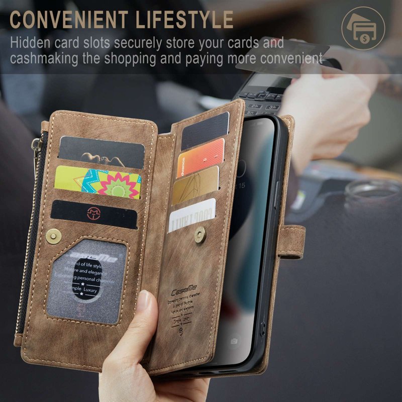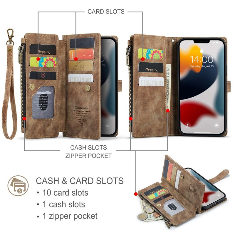 - Stort Dragkedjeutrymme: Unik dragkedjedesign ger mer plats för sedlar, mynt och kreditkort utan att repa skärmen.