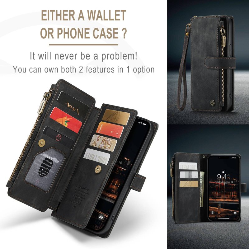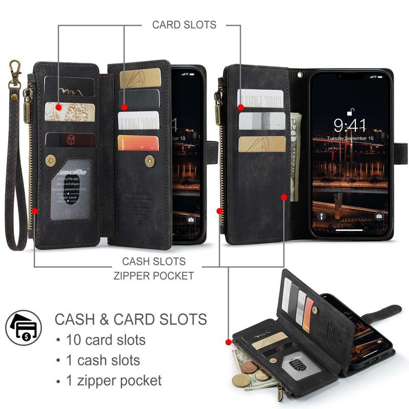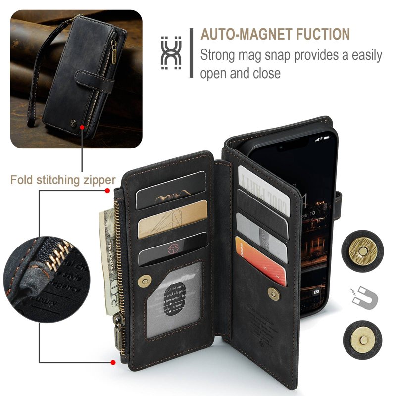 - Stort Dragkedjeutrymme: Unik dragkedjedesign ger mer utrymme för sedlar, mynt och kort utan att repa skärmen.