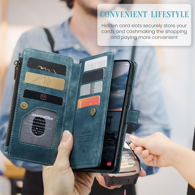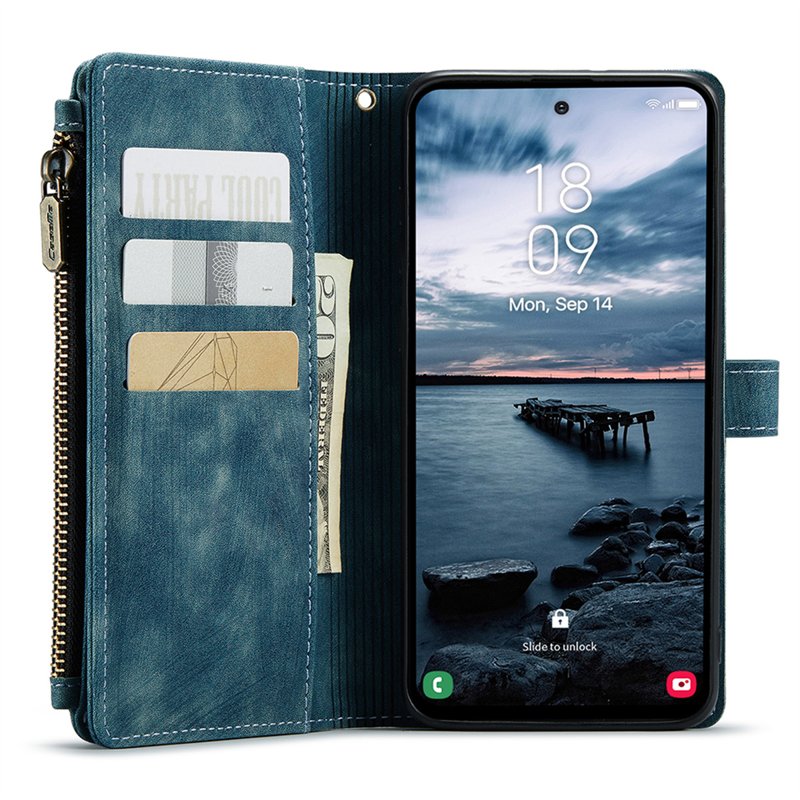 - Stort Dragkedjeutrymme: Unik dragkedjedesign ger mer utrymme för sedlar, mynt och kreditkort utan att repa skärmen.