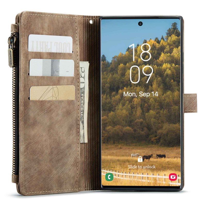 - Stort Dragkedjeutrymme: Unik dragkedjedesign ger mer utrymme för sedlar, mynt och kreditkort utan att repa skärmen.