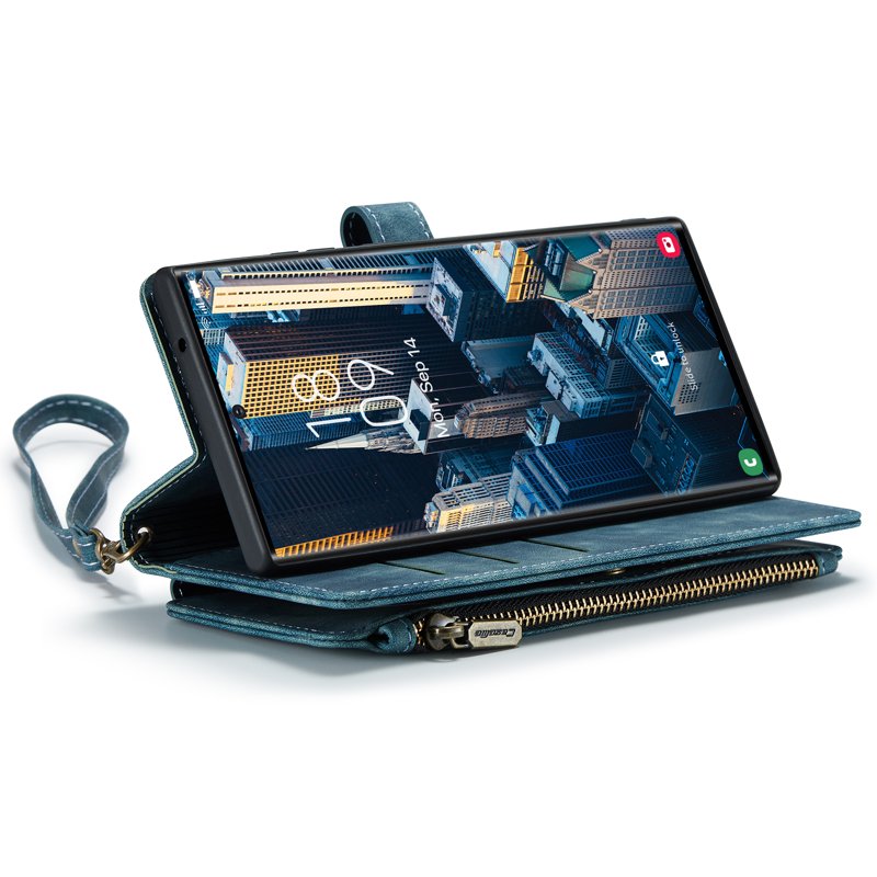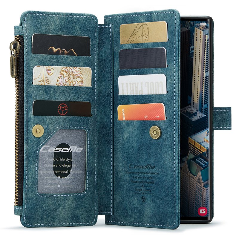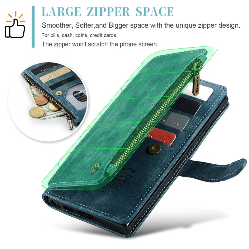 - Stor dragkedja: Den unika dragkedjan erbjuder mer utrymme för sedlar, mynt och kreditkort utan att repa skärmen.