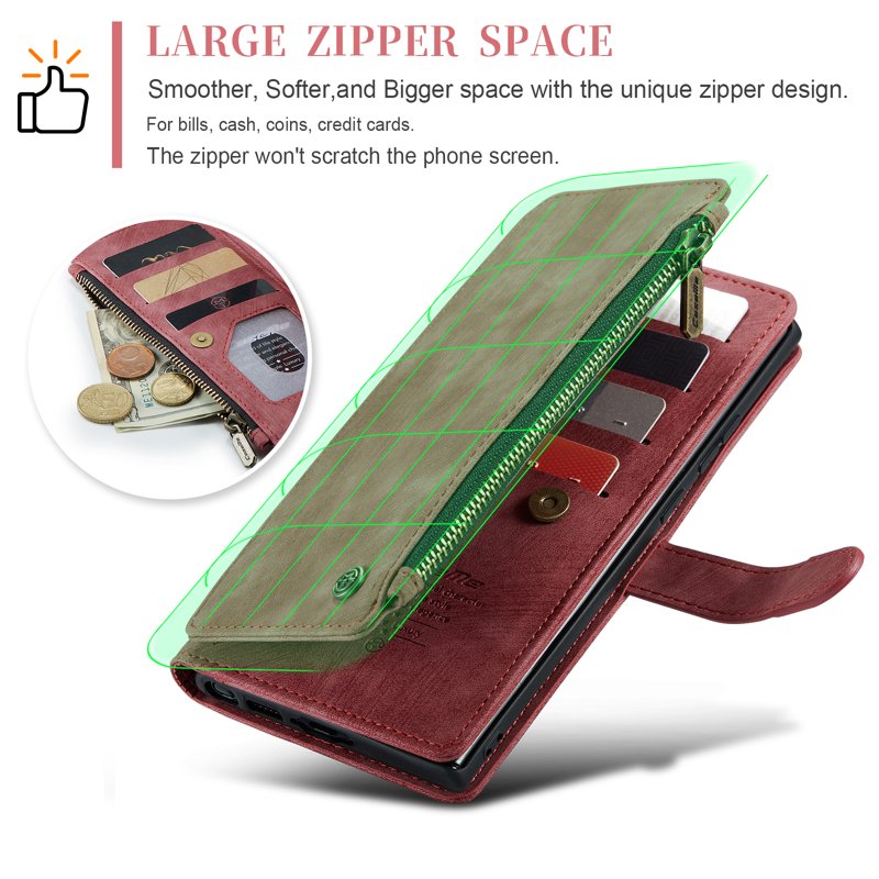 - Stort Dragkedjeutrymme: Unik dragkedja skapar ett mjukt och rymligt utrymme för sedlar, mynt och kort utan att repa skärmen.