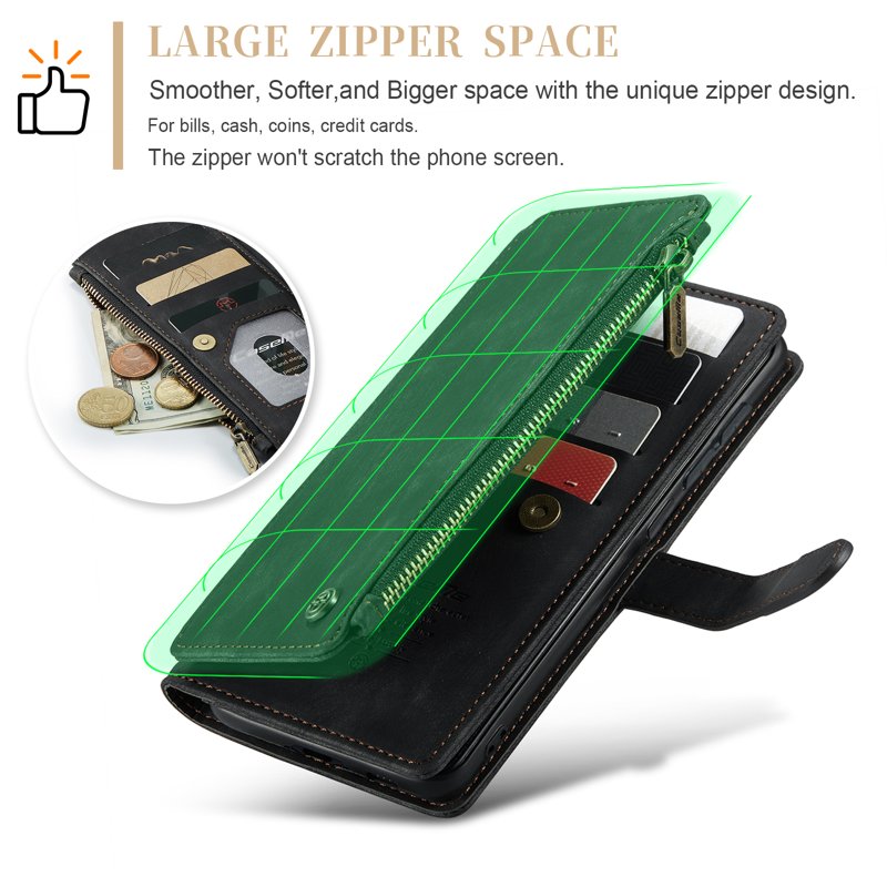 • Stort Zipperutrymme: Unik dragkedja ger mer utrymme för sedlar, mynt och kort utan att repa skärmen.
