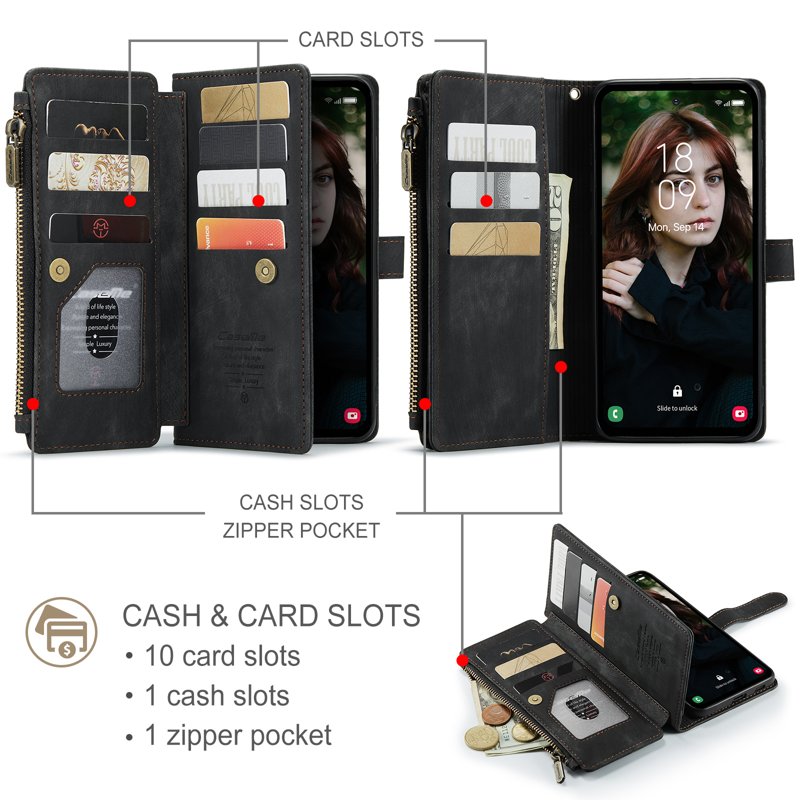 - Stort dragkedjeutrymme: Unik design ger mer plats för sedlar, mynt och kort utan att skada skärmen.