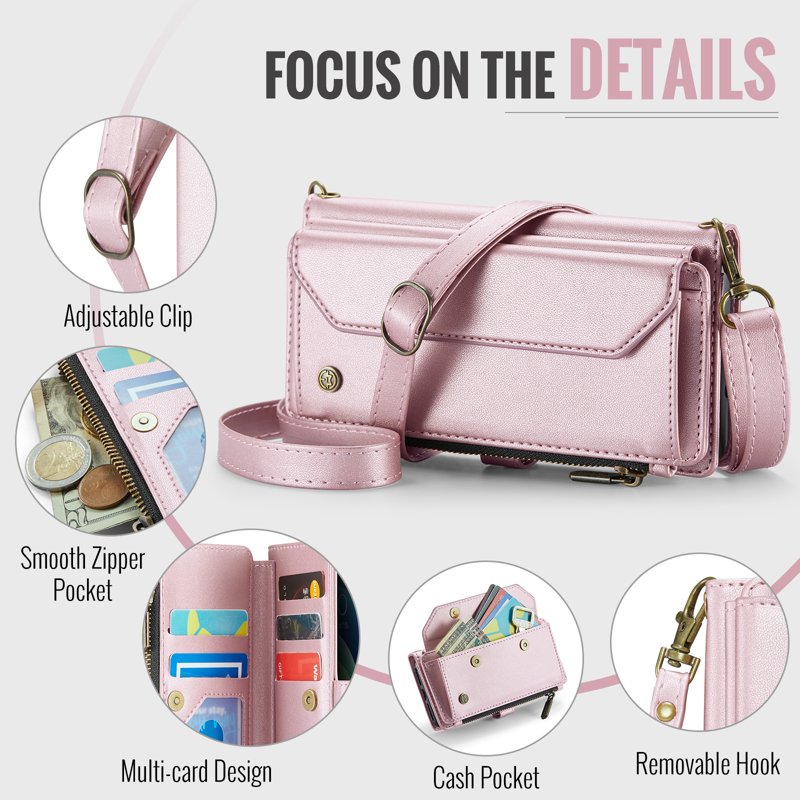• Generösa kort- och kontantfack: Innehåller 10 kortfack, 1 kontantfack, 1 dragkedjefack och en dedikerad myntficka för organiserad förvaring.