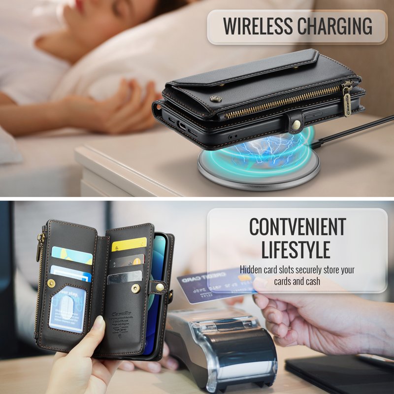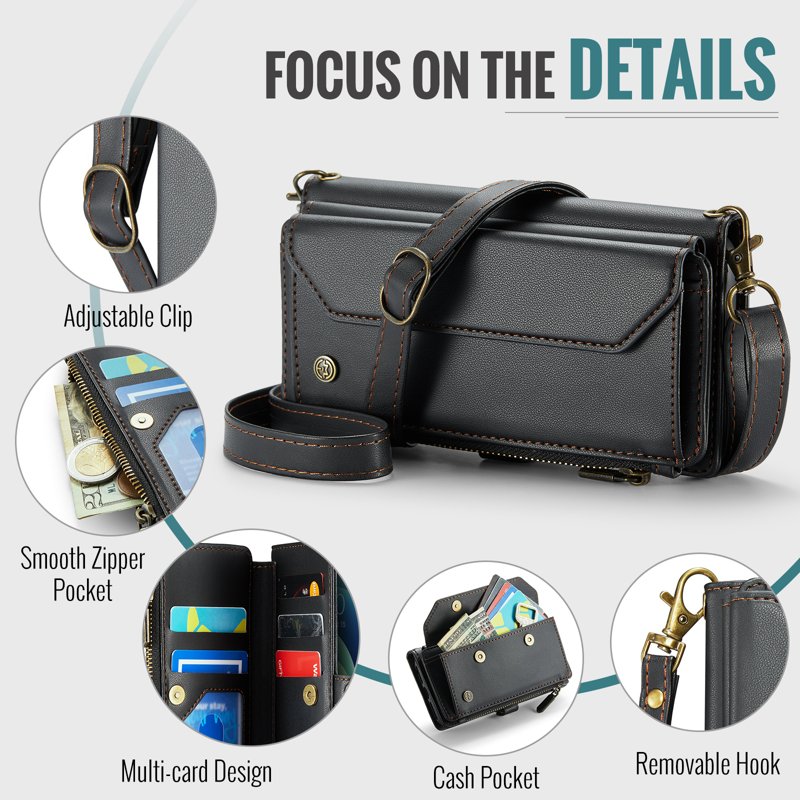 - Generösa kort- och kontantfack: Innehåller 10 kortfack, 1 kontantfack, 1 dragkedjefack och en myntficka för organiserad förvaring.