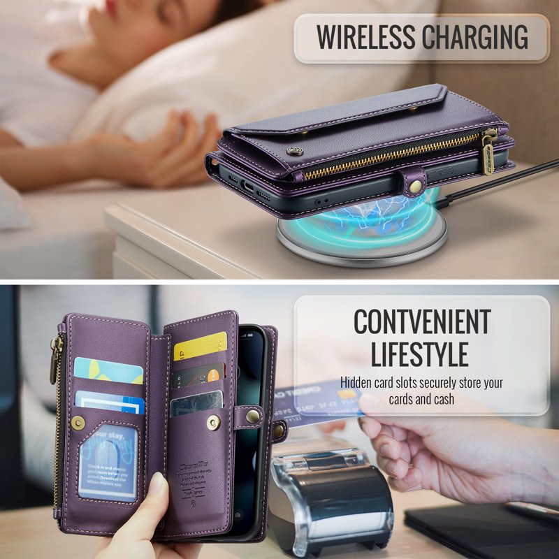 - Generösa kort- och kontantfack: Innehåller 10 kortfack, 1 kontantfack, 1 dragkedjefack och en dedikerad myntficka för organiserad förvaring.