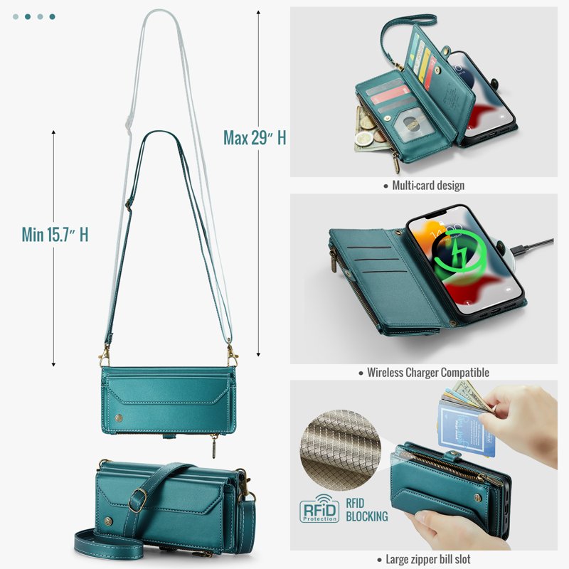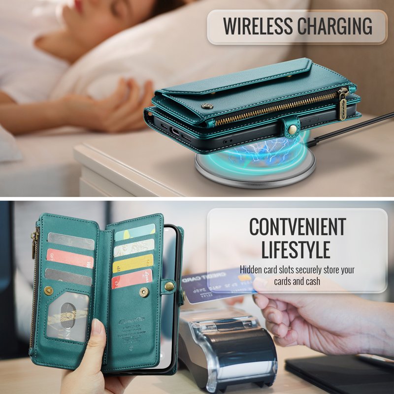 • Generösa kort- och kontantfack: Innehåller 10 kortfack, 1 kontantfack, 1 dragkedjefack och en dedikerad myntficka för organiserad förvaring.