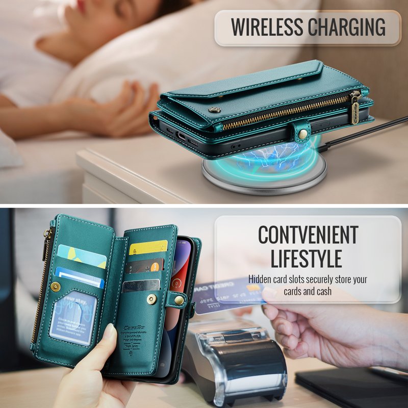 • Generösa kort- och kontantfack: Innehåller 10 kortfack, 1 kontantfack, 1 dragkedjefack och en myntficka för organiserad förvaring.