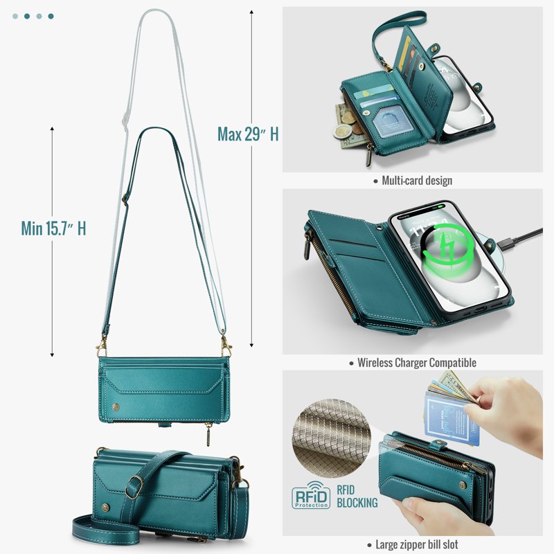 • Generösa kort- och kontantfack - Innehåller 10 kortfack, 1 kontantfack, 1 dragkedjefack och en myntficka för organiserad förvaring.