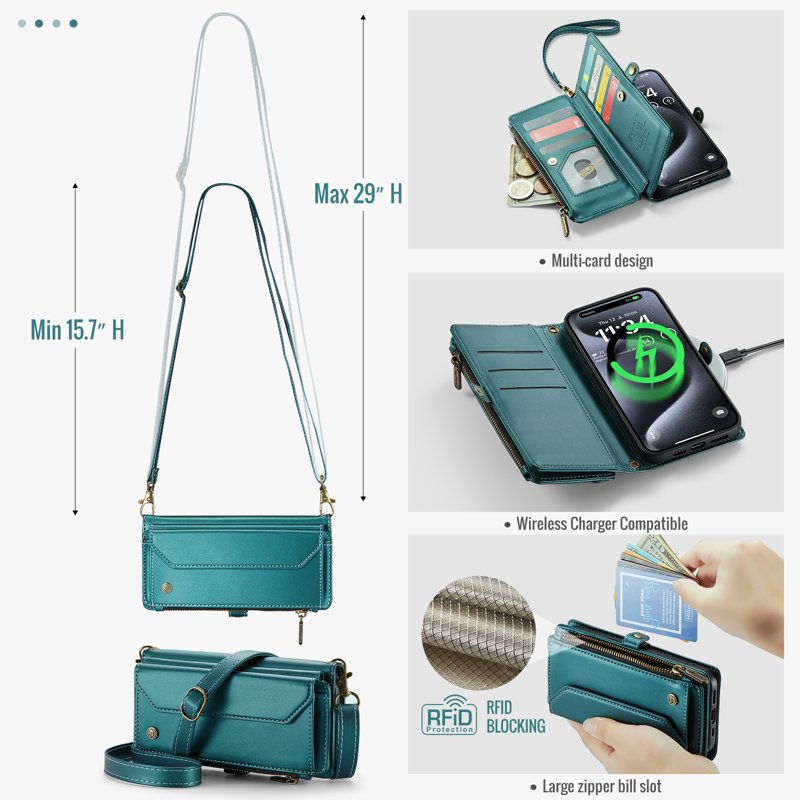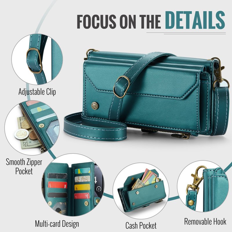 • Generösa kort- och kontantfack: Innehåller 10 kortfack, 1 kontantfack, 1 dragkedjefack och en dedikerad myntficka för organiserad förvaring.