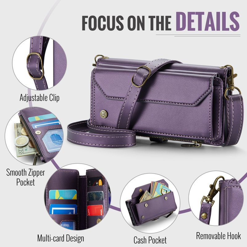 • Generösa kort- och kontantfack: Innehåller 10 kortfack, 1 kontantfack, 1 dragkedjefack och en myntficka för organiserad förvaring.