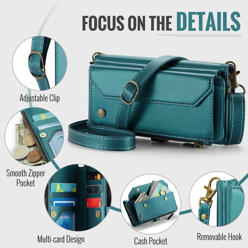 • Generösa kort- och kontantfack: Innehåller 10 kortfack, 1 kontantfack, 1 dragkedjefack och en myntficka för organiserad förvaring.
