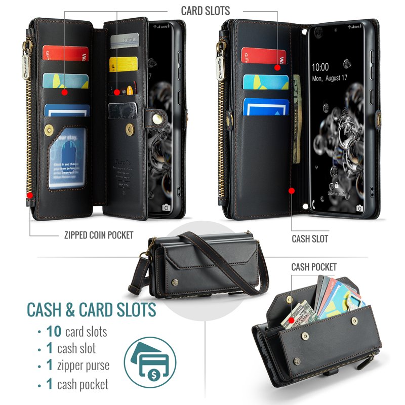 - Generösa kort- och kontantfack - Innehåller 10 kortfack, 1 kontantfack, 1 dragkedjefack och en myntficka för organiserad förvaring.