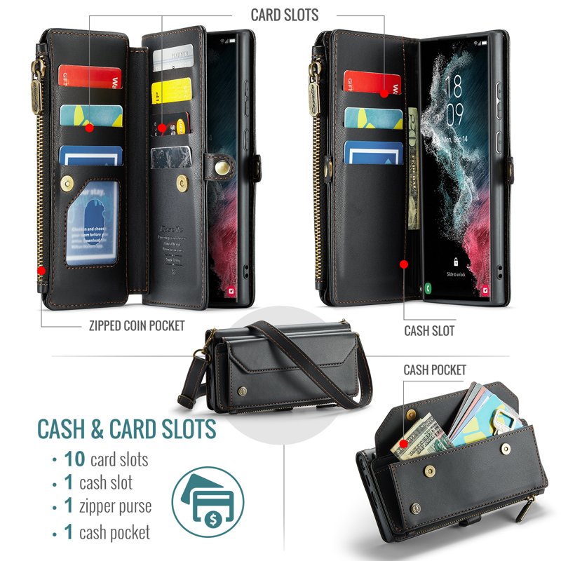 - Generösa kort- och kontantfack - Innehåller 10 kortfack, 1 kontantfack, 1 dragkedjefack och en dedikerad myntficka för organiserad förvaring.