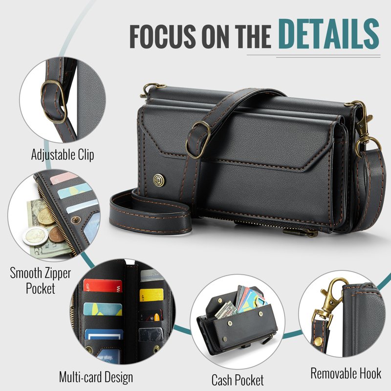 - Generösa kort- och kontantfack: Innehåller 10 kortfack, 1 kontantfack, 1 dragkedjefack och en dedikerad myntficka för organiserad förvaring.