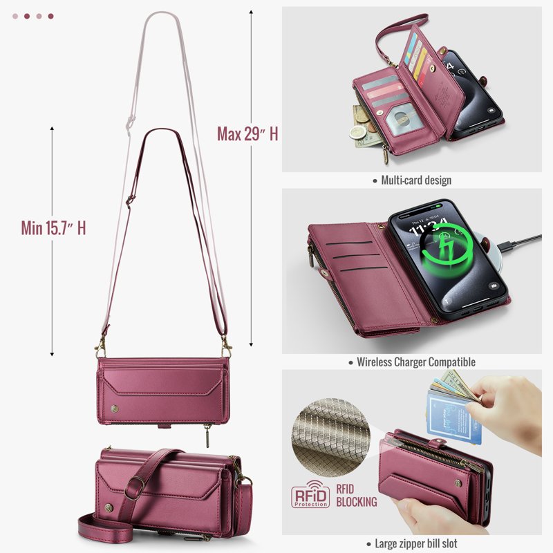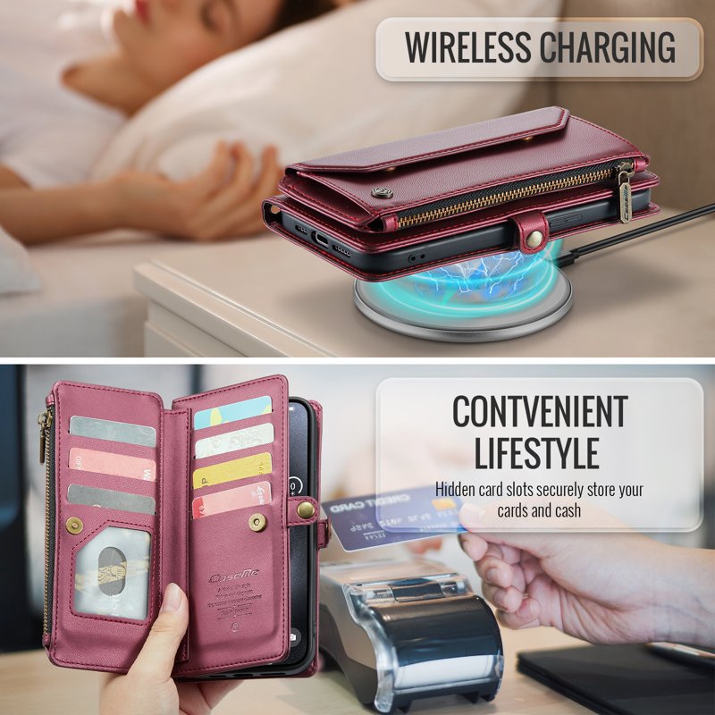 • Generösa kort- och kontantfack: Innehåller 10 kortfack, 1 kontantfack, 1 dragkedjefack och en dedikerad myntficka för organiserad förvaring.