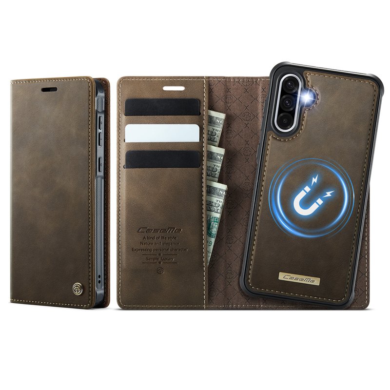 - Magnetisk Avtagbar Plånboksdesign: Tre kortfack och en sedelplats för kreditkort och kontanter. Kan användas som ett enkelt skal eller som ett läderfodral.