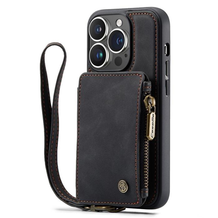 CASEME iPhone 14 Pro Plånboksfodral C20 Zipper Pocket Kickstand i PU-Läder med Rem - Svart