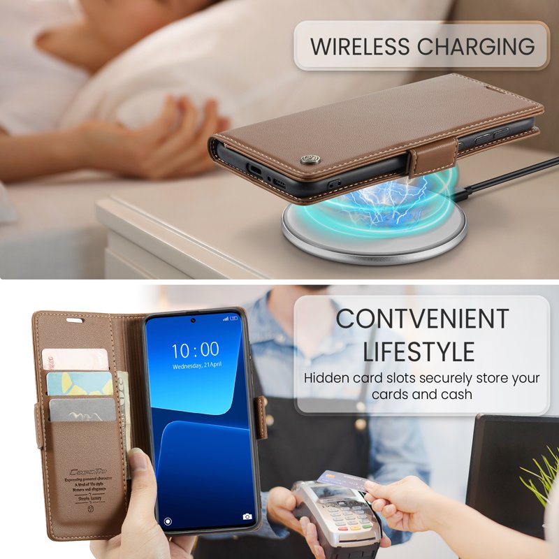 Denna plånboksfodral kombinerar elegans med funktionalitet. Tillverkat av högkvalitativt PU-läder och TPU, erbjuder det ett komplett skydd för din telefon. Med smarta fack för kort och kontanter blir din vardag enklare. Dessutom skyddar den din personliga information med avancerad RFID-blockering.