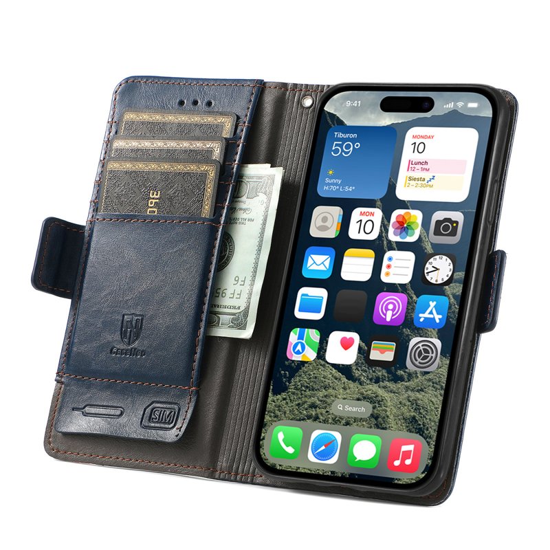 CASENEO iPhone 16 Plus Skal i äkta läder kombinerar stil och funktionalitet. Det mörkblå skalet är tillverkat av högkvalitativt PU-läder och TPU. Det ger ett elegant utseende och skydd för din telefon. Perfekt för den moderna affärsmannen eller kvinnan.