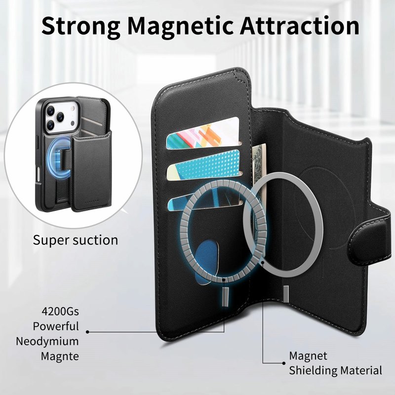 - Magnetisk Avtagbar Design: Tre kortfack och en sedel ficka för kreditkort, ID och kontanter. Den magnetiska avtagbara plånboken fungerar även som ett praktiskt stativ för handsfree-visning.