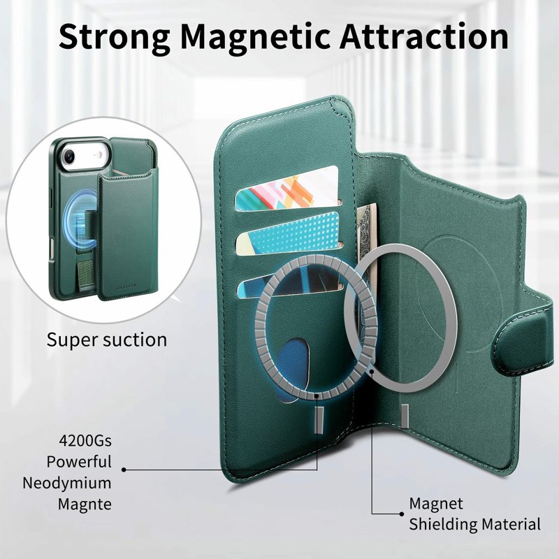 - Magnetisk Avtagbar Design: Tre kortfack och en sedelplats för kreditkort, ID och kontanter. Den magnetiska plånboken fungerar även som ett praktiskt stativ för handsfree-visning.