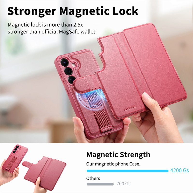 - Magnetisk avtagbar design: Tre kortfack och en sedelplats, fungerar även som ställ för handsfree-visning.