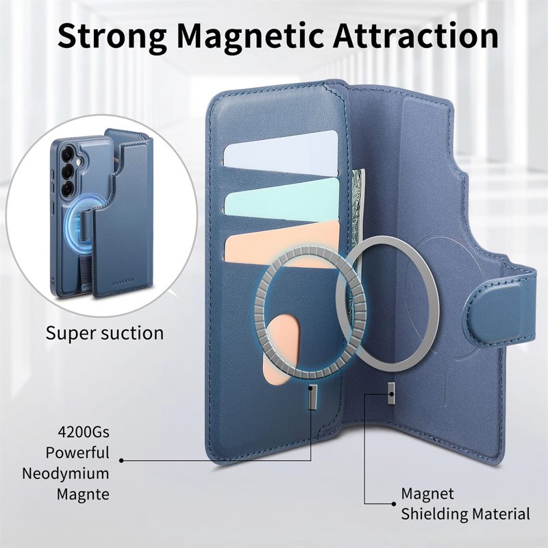 • Magnetisk Avtagbar Design: Tre kortfack och en sedelplats för kreditkort, ID och kontanter. Fodralet fungerar även som en praktisk ställning för handsfree-visning.