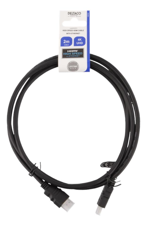 DELTACO HDMI kabel, HDMI High Speed with Ethernet, 4K, UHD i 60Hz, 19-pin ha-ha, 2 m, svart