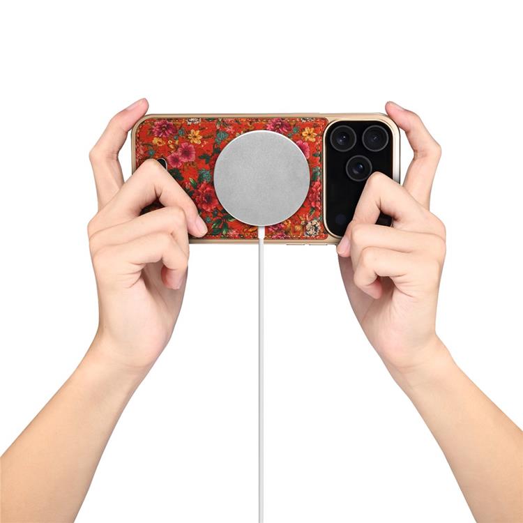 DENIOR iPhone 17 Pro Mobilskal MagSafe Detachable Bakpanel Flower Läder PC TPU - Peony Röd