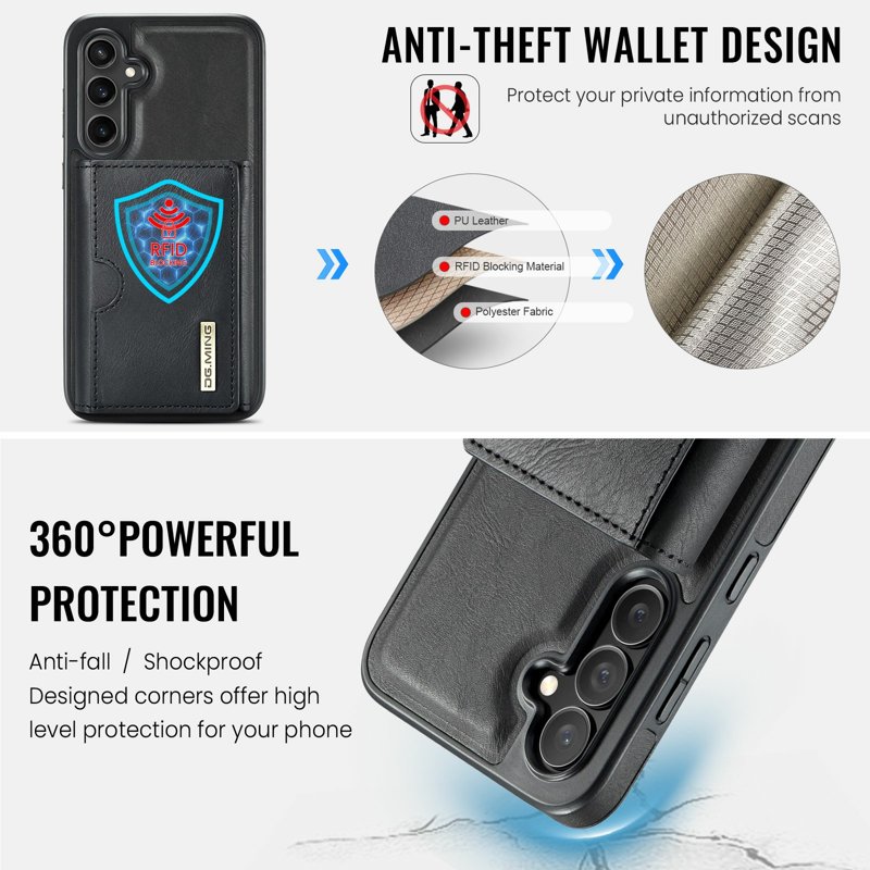 - RFID-skydd och ställfunktion: Skyddar dina kort från obehörig avläsning och fungerar som ställ för handsfree-visning.