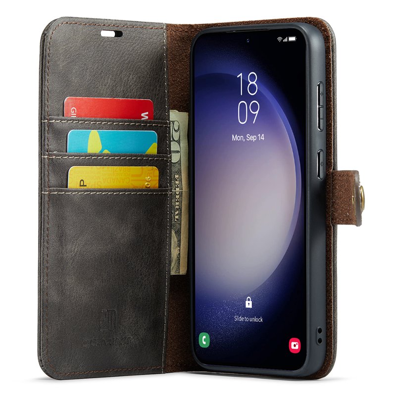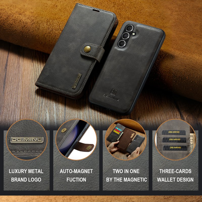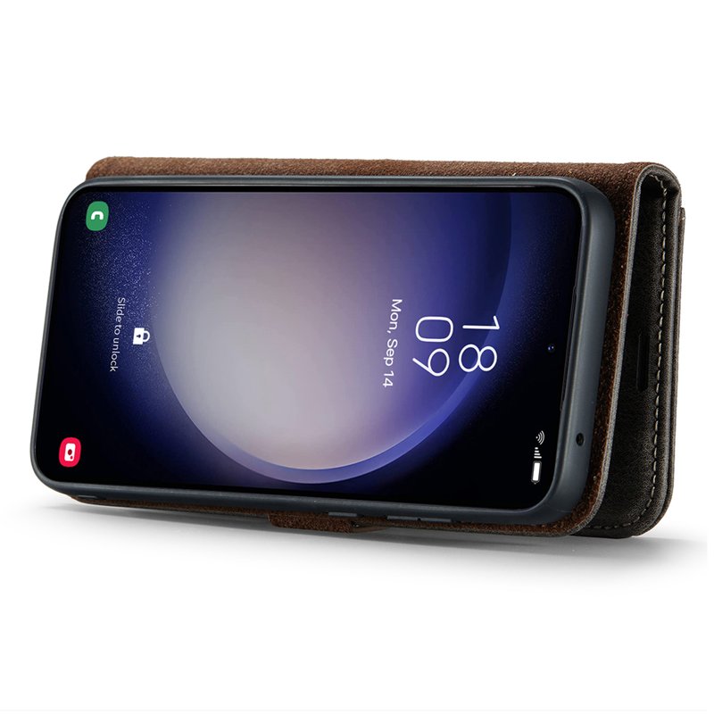 Detta 2-i-1 plånboksfodral kombinerar stil och funktionalitet. Med en delad läderplånbok och en avtagbar baksida i läderbelagt PC-material, erbjuder det både skydd och praktiska lösningar för din smartphone. Perfekt för den moderna användaren som värdesätter både design och användbarhet.