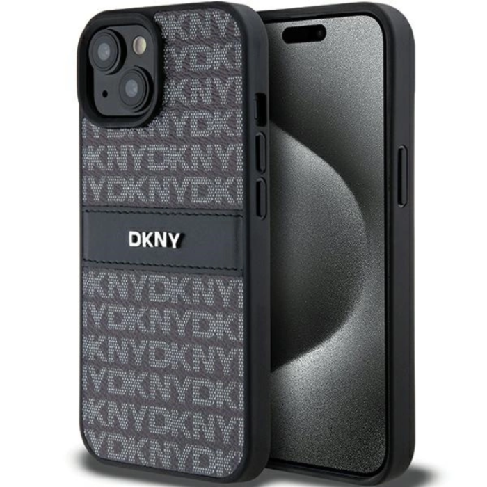 DKNY iPhone 15/14/13 Mobilskal Läder Mono Stripe & Metal Logo - Svart